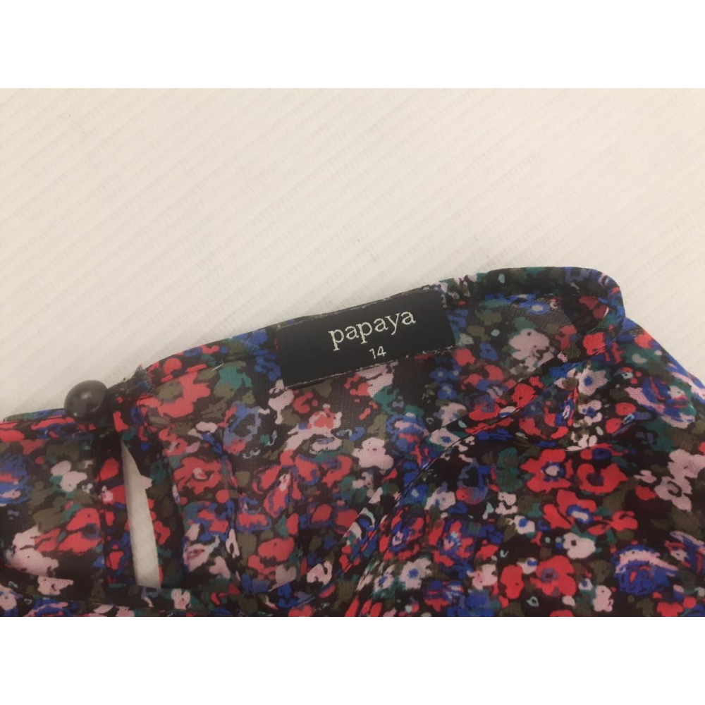 Elegancka bluzka damska marki PAPAYA ozdobiona kwiatowym wzorem oraz falbanami. Idealna na letnie dni, lekka i delikatna w dotyku. Doskonała propozycja dla kobiet lubiących subtelny i romantyczny styl. Rozmiar z metki: 42 Stan: bardzo dobry WYMIARY: Długość: 58 cm Obwód pod pachami: 108 cm Obwód w pasie: 110 cm Długość rękawa od pachy: 37 cm |